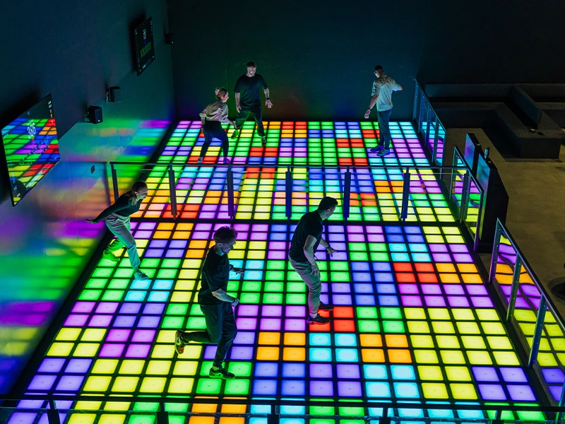 WOOP! Pixel ist Gaming in Echtzeit, live auf einem 5×5 m² großen Spielfeld mit über 250 leuchtenden Kacheln.